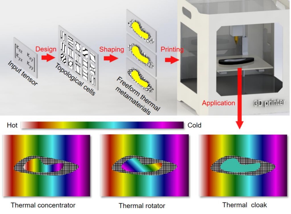 12月10日,《自然·通讯》(Nature Communications)在线刊发了机械木瓜视频高亮教授团队与新加坡国立大学仇成伟教授、能源木瓜视频胡润副教授关于热超构材料拓扑优化设计的最新研究成果“Robustlyprintable freeform thermal metamaterials(稳健可打印的自由形状热超构材料)”。机械木瓜视频博士生沙伟、副教授肖蜜为论文共同第一作者,高亮教授、仇成伟教授、胡润副教授为论文共同通讯作者,华中科技大学数字制造装备与技术国家重点实验室为论文第一完成单位。 超构材料因具有常规自然材料不具备的属性被学术界和工业界广泛关注,如力、热、声、电磁超构材料等,其中热超构材料因可操控热流获得一系列超常热学功能(如:热隐身、热集中、热伪装、热旋转等)备受关注。随着变换光学和散射抵消方法应用于热学领域,一系列具有不同功能的热超构材料纷纷被设计和制备,但是,目前热超构材料设计仍面临三大挑战:(1)利用变换热学法设计的热超构材料需采用非均匀、各向异性的材料参数,而常规材料往往不具备,使得实验制备热超构材料难度很大;(2)热超构材料结构形状受限,目前以圆形、椭圆形等规则形状的热超构材料制备居多,影响了热超构材料的工程适用性;(3)采用数值优化方法设计热超构材料依赖背景温度场和目标超常热学属性,影响了设计的灵活性和热超构材料的全方位功能性。因此,如何设计并制备具有自由形状且全方位功能性的热超构器件是热超材料领域亟需解决的难题。 图1 稳健可打印的自由形状热超构材料拓扑优化设计 针对以上难题,研究团队提出了一种稳健可打印的自由形状热超构材料拓扑优化设计方法(图1),采用拓扑优化设计具有指定导热系数的拓扑功能单胞,组装生成热超构材料,开展了自由形状热超构材料拓扑优化设计-热超构器件增材制造-热学仿真与实验性能测试。研究团队按照上述思路,设计了具有自由形状的热集中、热旋转和热隐身等三类热超构材料构型,并开展了数值仿真(图2)和热学实验(图3)性能测试,结果表明无论热流从何种方向通过三种热超构材料,其内部各自呈现出良好的热集中、热旋转和热隐身效果。 图2 拓扑优化设计的三种热超构材料及其数值仿真温度场分布(左:热集中;中:热旋转;右:热隐身) 图3 3D打印制备的热超构器件及其热学实验温度场分布 研究团队采用拓扑优化方法设计了具有自由形状、全方位功能性的热集中、热旋转和热隐身超构材料,达到了当前利用混合材料结构实现热超构材料设计的最好水平,将有力推动热超构材料在航空航天、电子等领域的工程应用。研究工作得到了国家自然科学基金(52076087)、国家重点研发计划(2020YFB1708300)等项目资助。(原文链接://mp.weixin.qq.com/s?__biz=MzU1OTI0NjU0Mw==&mid=2247484318&idx=2&sn=29300743467c0a4f98e40c28e609e3ed&chksm=fc1b7e3ecb6cf72807021182ce55d71e1e8531abb50c660a871555a2332b315eb8d9bb3254c6&scene=27)