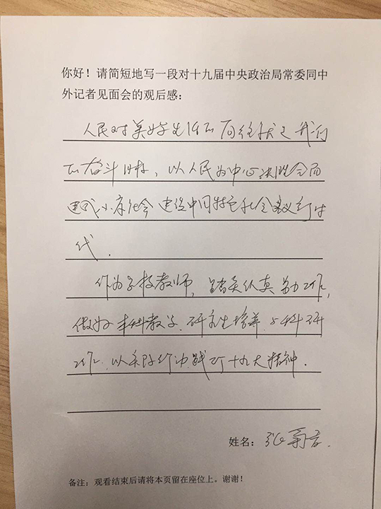 作为一名新入职的本科生辅导员,听完习近平总书记在记者见面会上的讲话,我深有感悟。来自各个国家的八百余封贺信彰显了我国的国际地位。对学生的思想政治教育和理想引领也“一个都不能少”。我要以实际行动,贯彻落实十九大的精神,立足本职工作,引导教育学生艰苦奋斗、不辱使命、刻苦学习,做国家的栋梁之才!