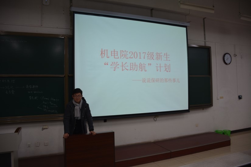 2017级新生“学长助航”计划硕士推免专场交流会。本次交流会邀请了机电院2014级机械设计制造及其自动化系的吉斌同学、秦亮同学和电气工程及其自动化系的江伟斌同学,来为新生普及硕士推免相关事宜。