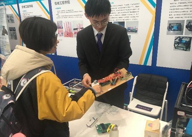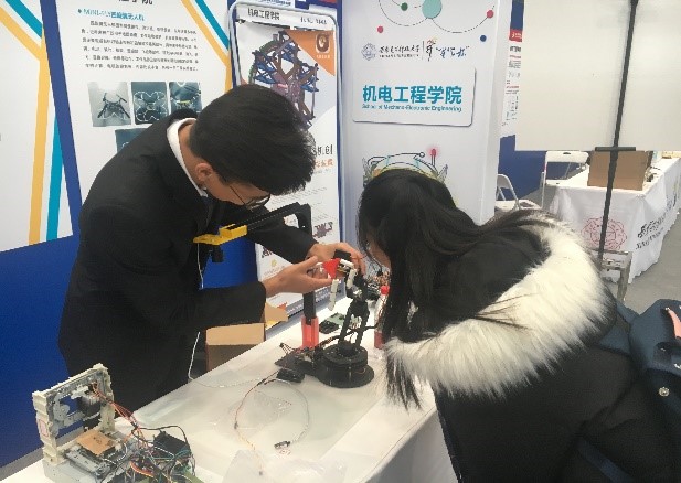 早在主馆的开幕式正式开始之前,副馆作品展区就已经热闹非凡。在我院团委老师及科协的精心筹备下,我院展区的优秀作品琳琅满目。一路杀进冠军争夺赛的柔性抓取机械爪、创新设计的激光雕刻机,各种炫酷机器人等高水平作品展现了机电院学子卓越的科技创新水平与科技实践能力,由低年级同学制作的遥控小车、光立方也充分体现了他们对科技制作高昂的热情,趁着“星火杯”的东风,我院再次掀起一阵科技创作的热潮。讲解人员也是早早到位,为前来参观的嘉宾献上最专业最细致的讲解,展现机电院学生的独特风采。