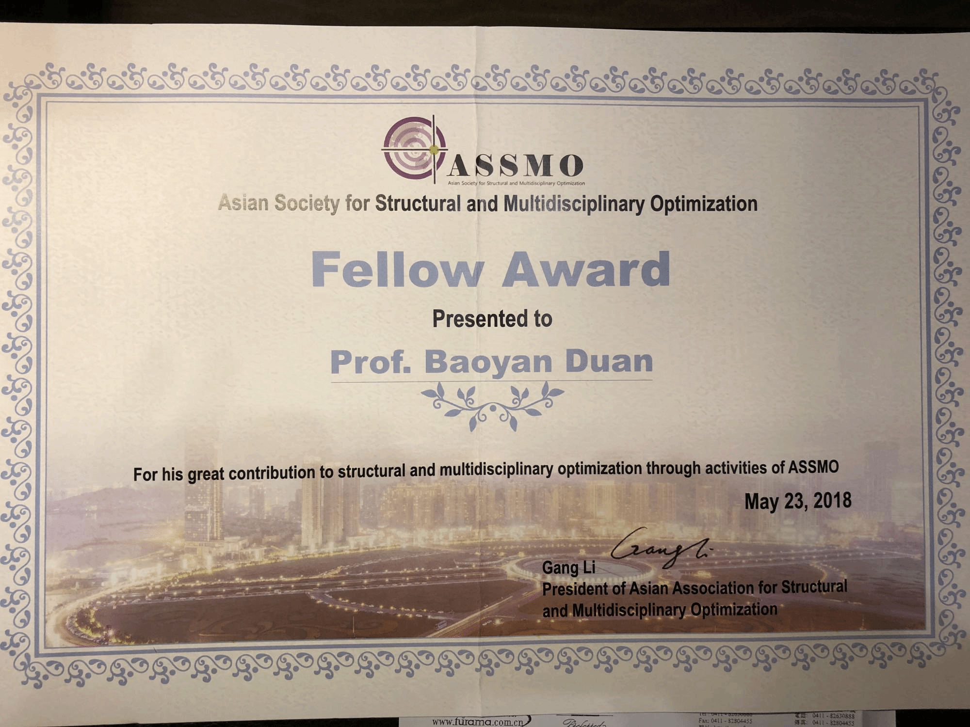 段宝岩教授被授予亚洲结构与多学科优化终身成就奖。这是我国该领域获此殊荣的第二人,第一位是中科院院士、原大连理工大学校长程耿东教授。