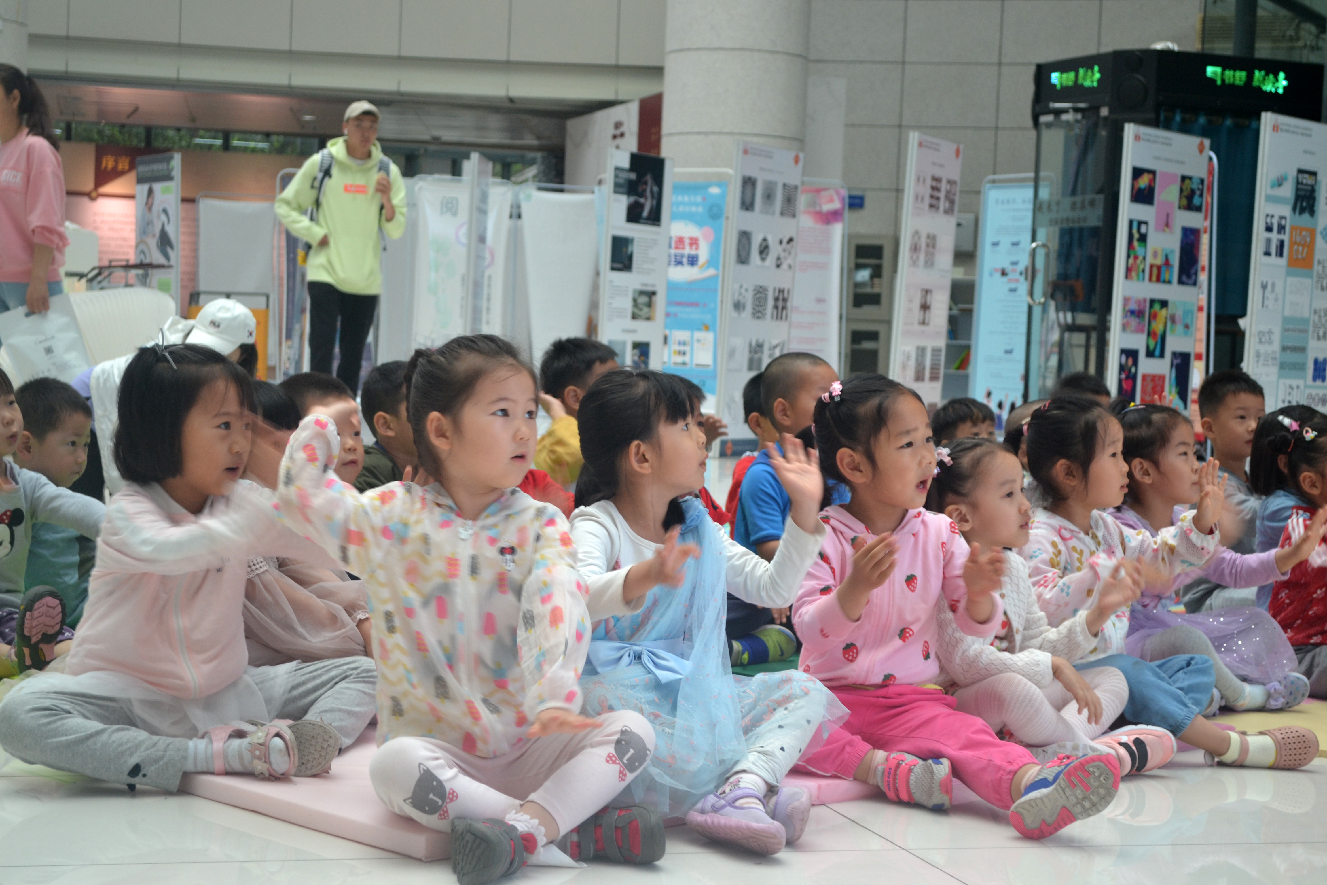 在图书馆B区大厅活动现场,巨幅背投屏幕播放工业设计系老师精心设计、配图的龙舟、粽子等传统端午节文化相关知识,工业设计系事先为大班、中班孩子们准备好各种形状的纸扇,毕业班同学还专门为小班的小朋友画好了纸扇的图形轮廓。大厅中间是充满科技和现代感的木瓜视频