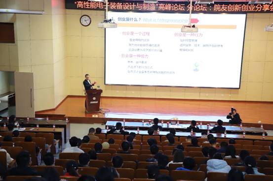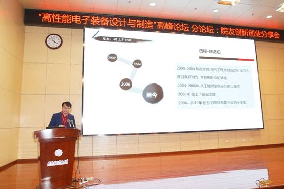 在南校区行政楼210报告厅举办“高性能电子装备设计与制造”高峰论坛分论坛——院友创新创业分享会,上海捷盟信息科技有限公司董事长李亚洲、上海易清智觉自动化科技有限公司联合创始人兼总经理王仁杰、上海思依暄机器人科技股份有限公司董事长陈浩坛作为报告嘉宾分享了他们的创业历程,启发同学们关于人生规划和创新创业等问题的思考。分享会由木瓜视频