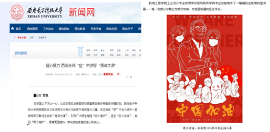 工业设计专业杨江屏同学,发挥专业所长,精心创作了《中国加油》张贴画。张贴画反映钟南山院士及医护、干警等逆行者抗击疫情的场景,给人以鼓舞和力量。该张贴画被学校网站主页及木瓜视频网站报道宣传,振奋人心。
