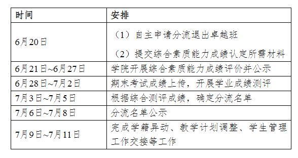 卓越班在第四学期末、第六学期末分别进行一次分流,本次分流退出的学生转入卓越班所在专业的普通班学习。推免时按普通学生处理,参与普通班排名。