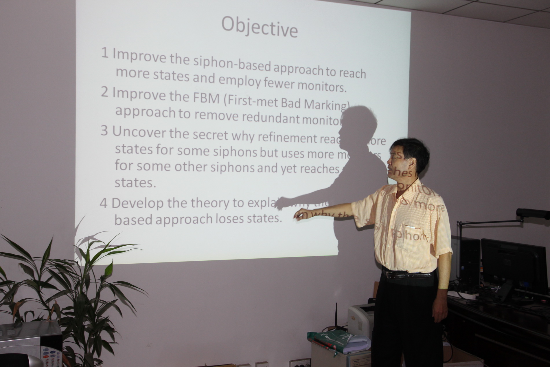 8月18日上午,赵玉教授在新科技楼1111作了题为“Improvement of Suboptimal Siphon- and FBM- Based Control Model of A Well-Known S3PR”的学术讲座。