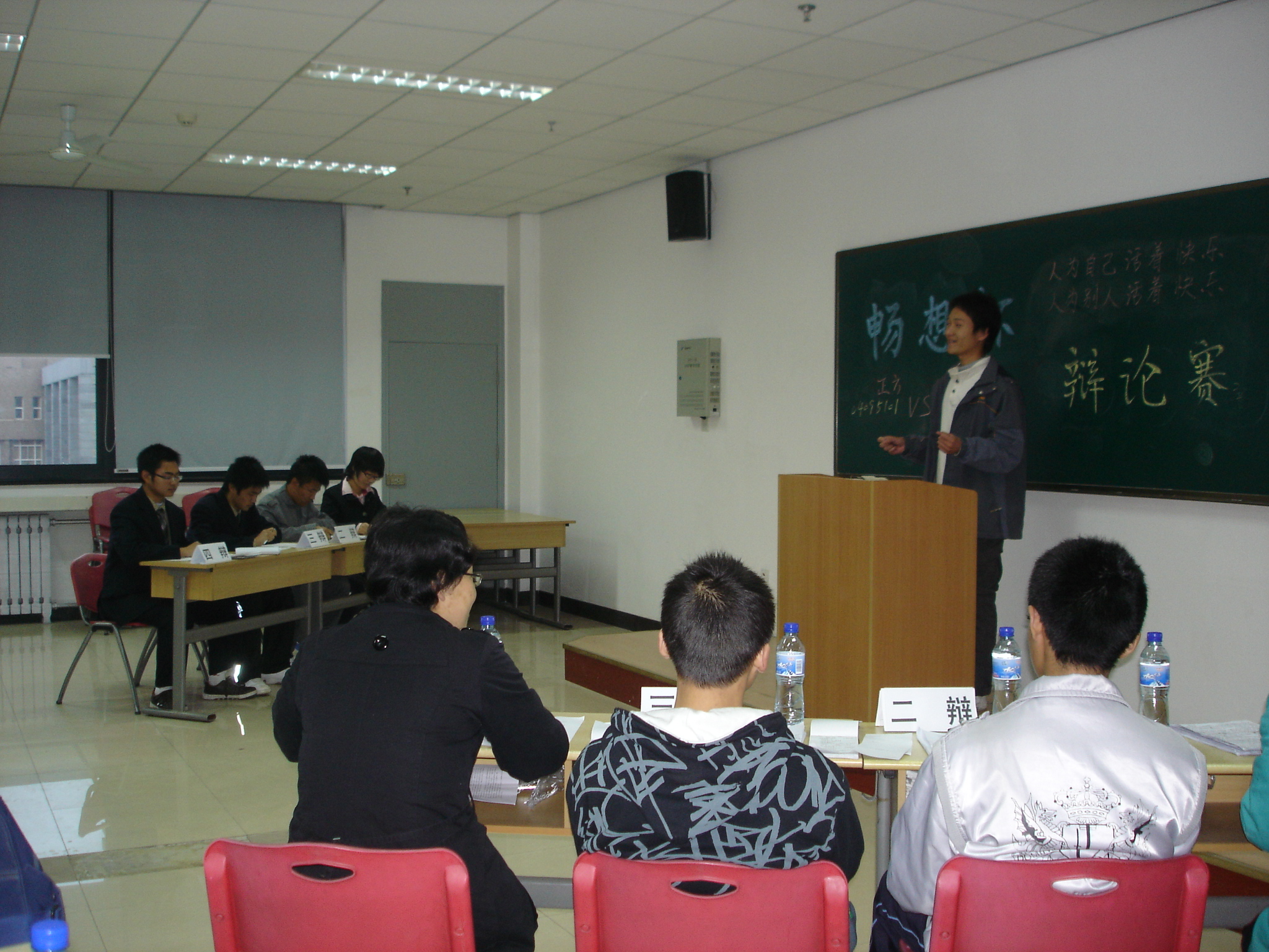 自辩论赛初赛开始,以各班为单位的辩论队围绕着各个论题尽情的展开了论战,无论是“大学生是否应该勤工俭学”还是“全才与专才哪个更适应社会”甚至是“成大事者应不应该拘小节”都引起正反双方的激烈辩论。