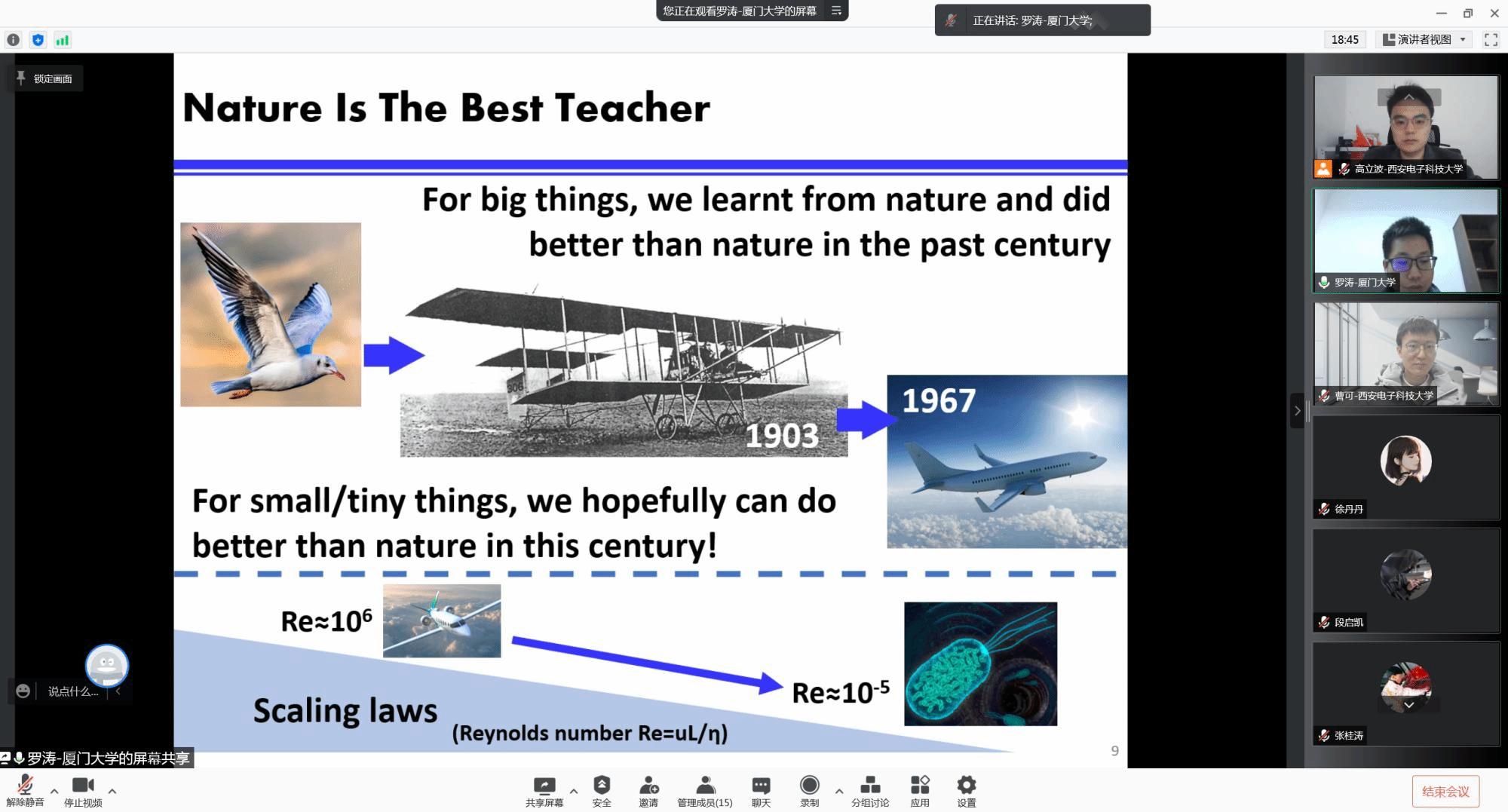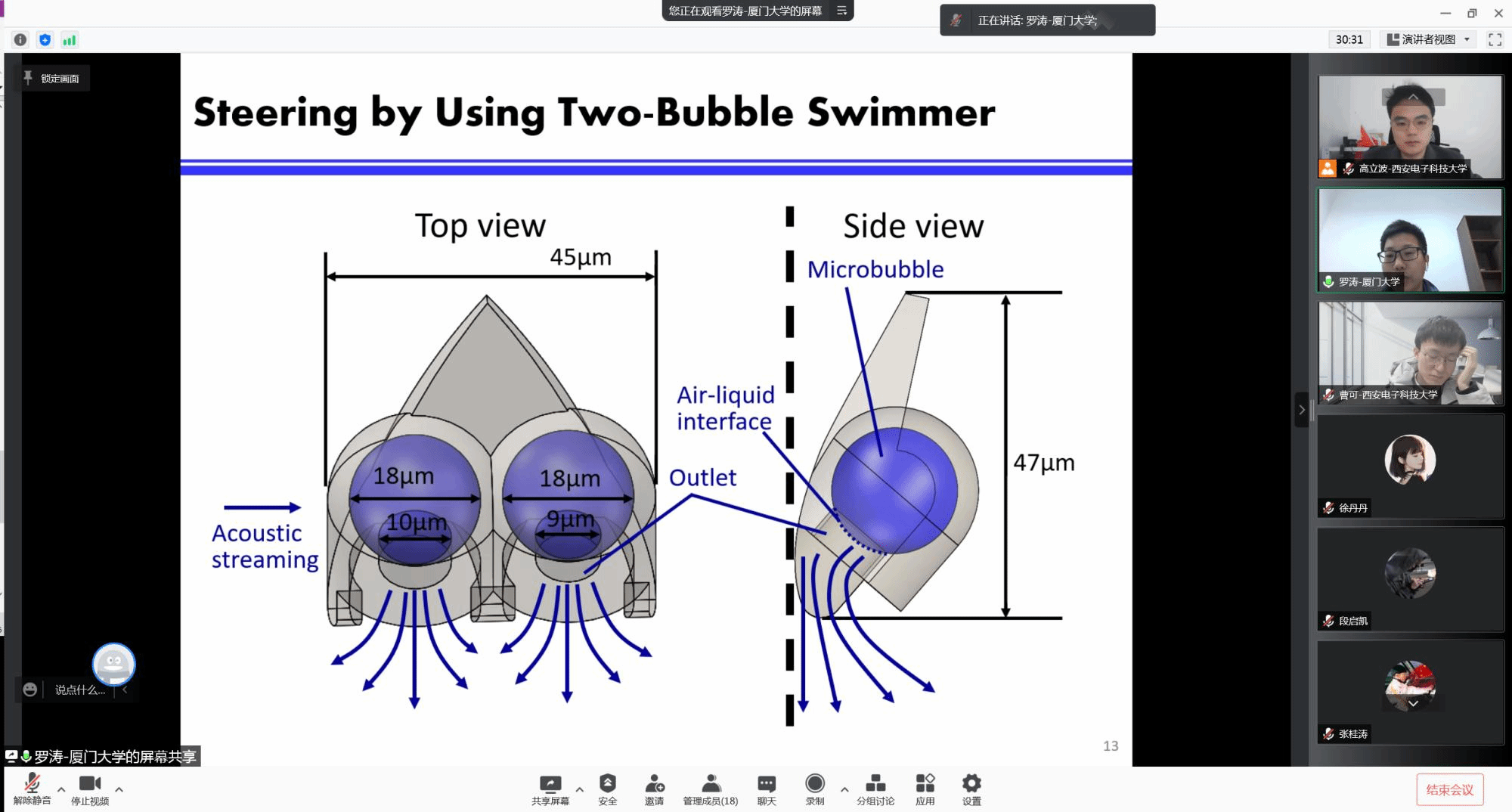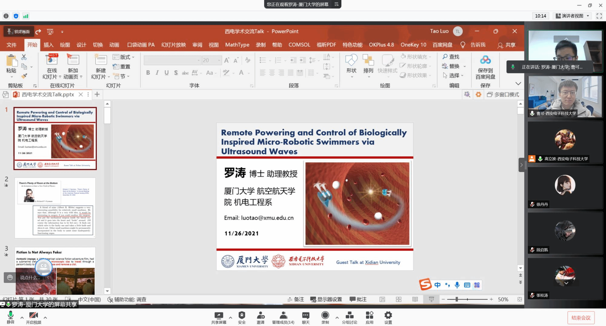 高立波的邀请,厦门大学航空航天木瓜视频机电工程系助理教授应邀在线上作了题为《Remote Powering and Control of Biologically Inspired Micro-Robotic Swimmers via Ultrasound Waves》的学术报告。本次报告因疫情原因改为线上,高立波,王明智,曹可等测控系师生参加,高立波副教授主持。