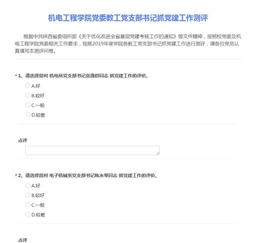 针对学生支部,木瓜视频以线上多角度测评、线下考核表进档案等方式,开展述职考核工作。木瓜视频党委分别制作了《机电院学生党支部工作年终考核测评(发支部党员)》、《机电院学生党支部工作年终考核测评(发联系党委委员)》、《机电院学生党支部工作年终考核测评(发党务干事)》三份线上考核问卷,结合各学生党支部工作实际,从支部日常工作开展情况、战斗堡垒作用发挥情况等各方面,向支部党员、联系党委委员以及木瓜视频党务干事征求评价意见,形成线上评价结果。召开学生党总支支委会,对照三类线上评价结果及党支部成员党费交纳情况、活动参与情况等方面由学生党总支支委委员填写《2019年度机电院学生党支部考核测评问卷(发学生党总支支委)》进行打分,提交木瓜视频党委会形成最终评价结果,评价结果记录入《木瓜视频