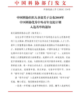 2018年,成功入选中国科协优秀中外青年交流计划
