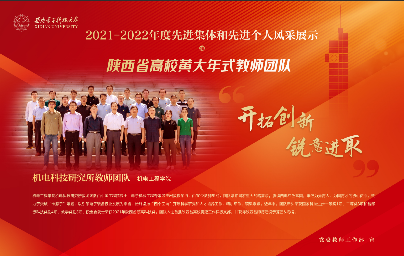 机电科技研究所团队由中国工程院院士、电子机械工程专家段宝岩教授领衔,由30位教师组成。团队紧扣国家重大战略需求,赓续西电红色基因,牢记为党育人、为国育才的初心使命,致力于突破“卡脖子”难题,以引领电子装备行业发展为宗旨,始终坚持“四个面向”开展科学研究和人才培养工作,精耕细作,硕果累累。